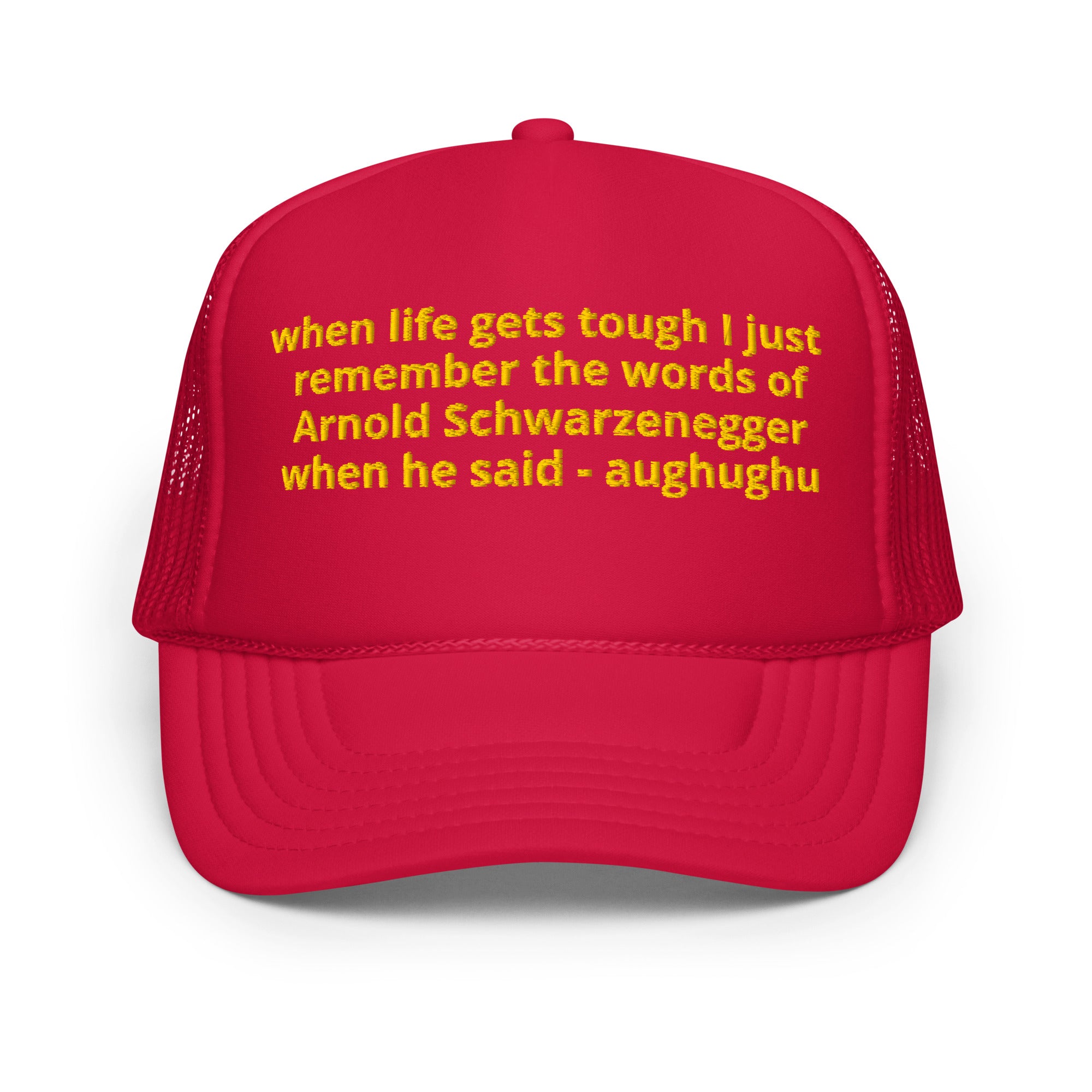 Inspired by the legendary mindset of Arnold Schwarzenegger—part bodybuilder, part action hero, part walking motivational quote—this trucker hat is basically a portable pep talk for your head.
